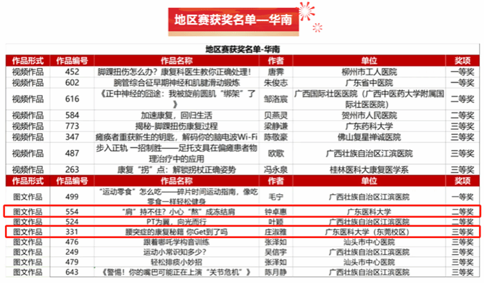 近日,在2025年中国康复医学会物理治疗专业委员会主办的“第六届康复与物理治疗科普大赛”中,我院康复医学系学生钟卓惠、庄淑雅凭借出色的创意与扎实的专业素养,从百余支参赛队伍中脱颖而出,分别斩获地区赛二等奖1项、三等奖1项,展现了学院在科普教育与创新实践中的新成果。1深耕科普创新,作品聚焦社会需求据悉,本次大赛吸引了全国医院、学校和机构的591个作品,作品涵盖神经康复、肌骨康复、心肺康复及儿童康复等各领域。我院康复学生立足康复医学特色,...