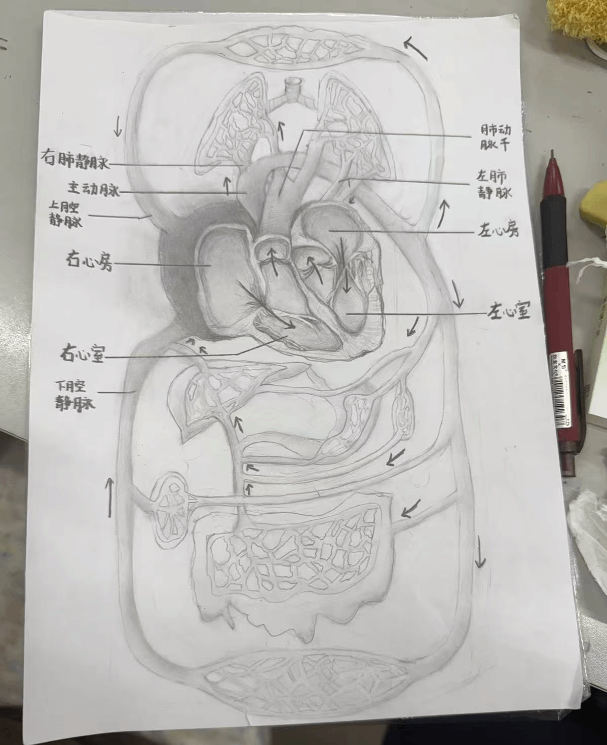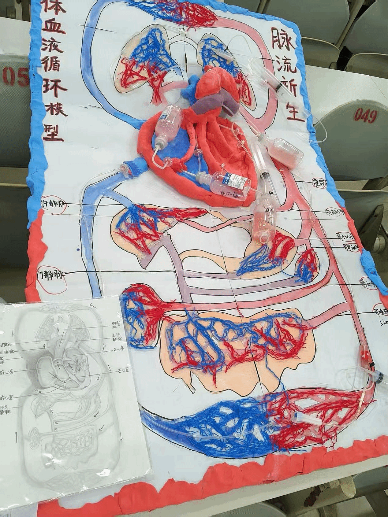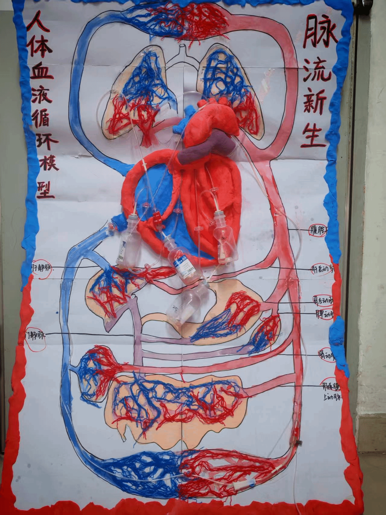 我们的模型名称是脉流新生——人体血液循环模型。基于当今我国老龄化严重以及在老年人群中心血管疾病多发,我们队伍决定做心血管系统的医学模型,展示心血管模型的结构以及揭示血液循环通路。用直观的视觉效果了解心血管系统的体循环和肺循环途径。我们粘土以及锡纸作为心脏的制作材料,其他结构主要用水彩进行描绘,我们还用毛线这种材料来制作毛细血管,不仅精妙地展示了毛细血管的柔软直径小多而交错纵横也使整体模型的元素更加丰富。特别的,我们的模型采用了常见的针筒、管子,作为心脏的动力系统,通过调整管子的直径我们还可以直观地模拟出动脉粥样硬化导致血管狭窄,血流量供应不足以及利用酸碱中和原理模拟动静脉血的变化过程。总的来说,我们的模型使用了简单日常的物品尽可能模拟了真实的心血管系统的工作。