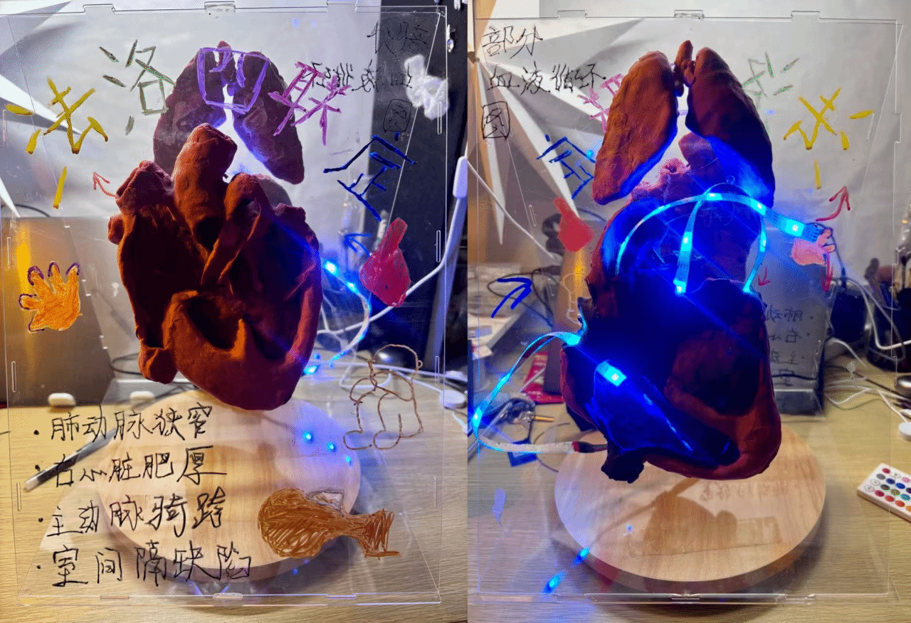 模型主体采用超轻粘土制作,创新结合可旋转亚克力板和自控彩色灯带,实现“生理解剖对比”与“血液动力学动态演示”的双重功能。