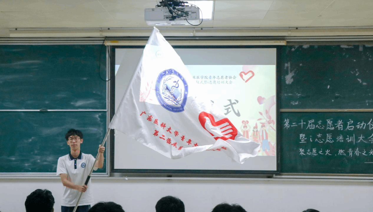 授旗与宣誓环节将仪式推向高潮。在《志愿者之歌》的旋律中,李明娴老师为二临青协授旗,由二临团委实践部部长陆宇翔同学作为代表接旗。