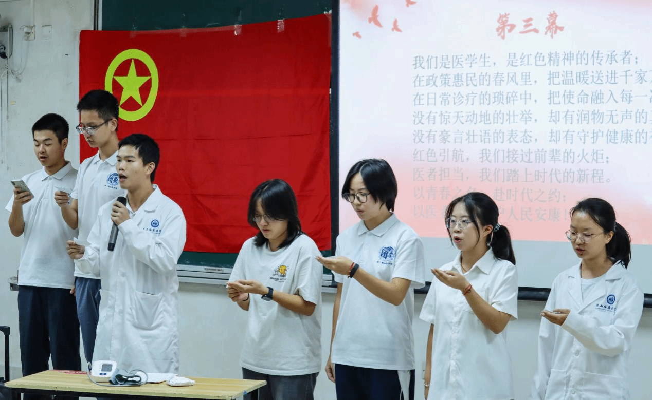 第四组学员带来的情景剧与朗诵的结合。从南湖红船星火追溯到医者逆行,展现红色信仰与青春担当。朗诵与情景的精彩演绎,不仅将医学知识展现得淋漓尽致,也让红色精神在医学青春征程中熠熠生辉。