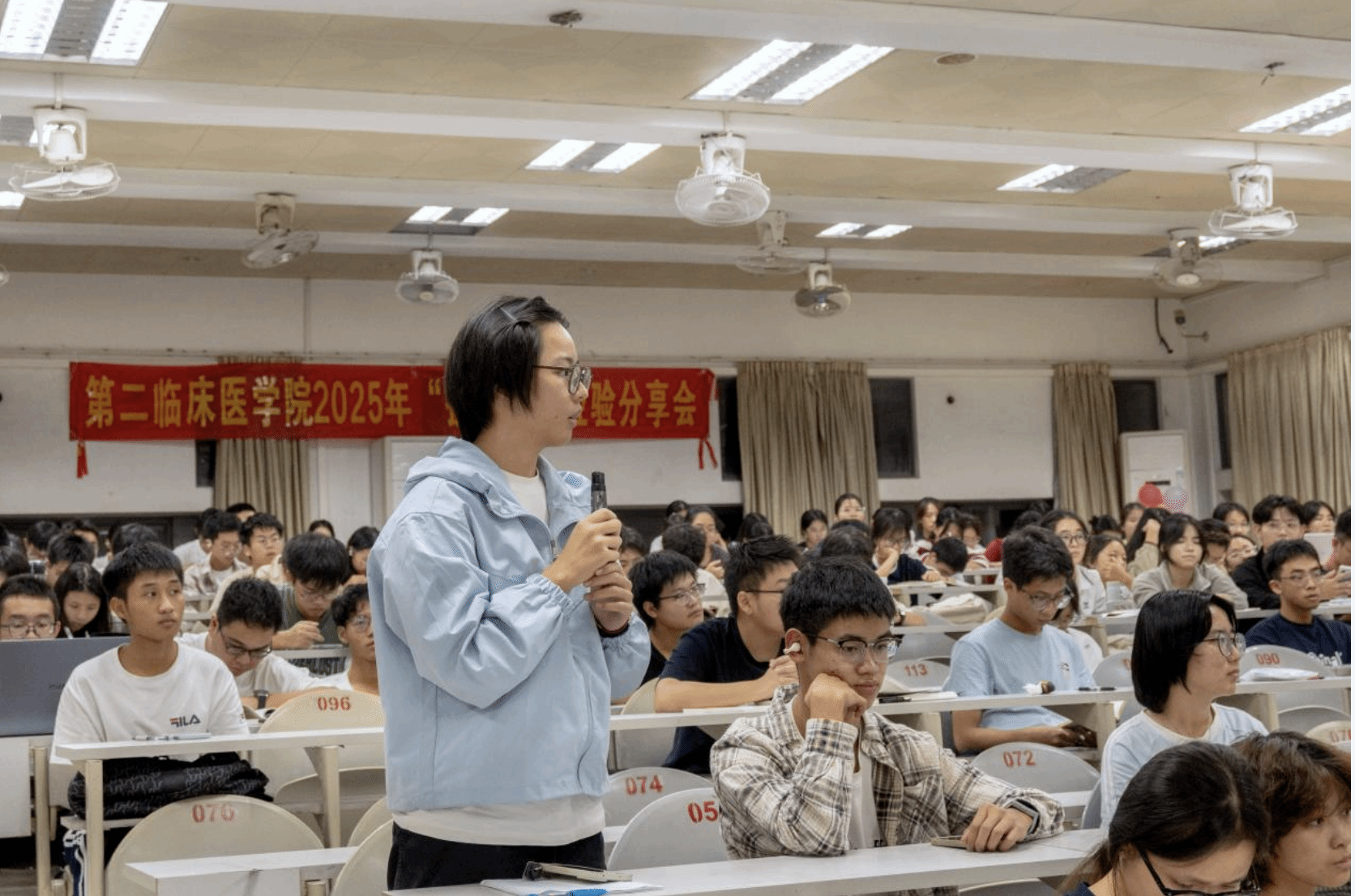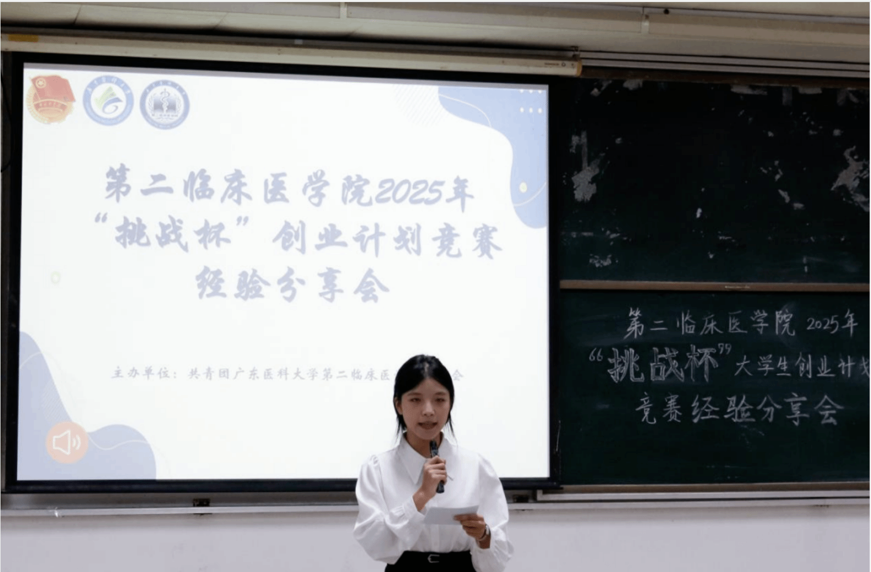 分享会开始,主持人向同学们介绍了大赛的参赛要求、赛事安排和赛程设置,简单说明了赛事的申报流程和奖项设置。在介绍完赛事的基本情况后,23级临床医学的黄宪智同学、袁晨悦同学和樊国涛同学作为往届优秀队伍代表对参赛者进行经验分享。
