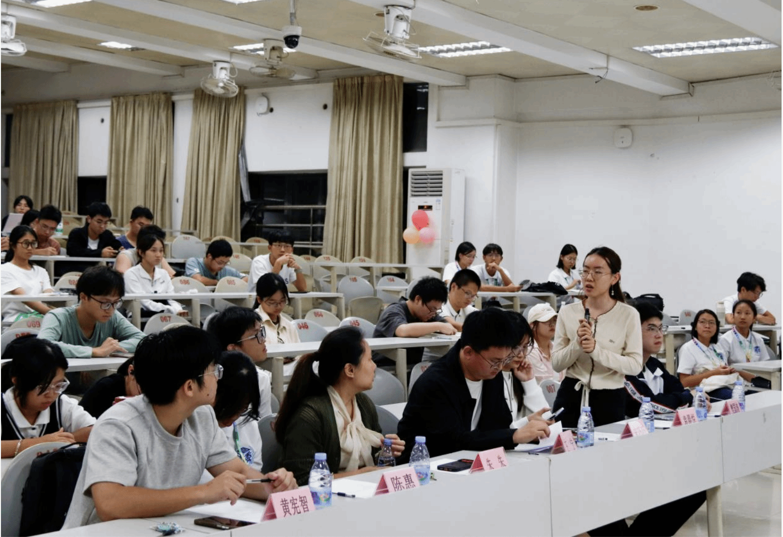 在答疑环节,同学们都积极提问,三位代表也一一给出了解答。总结这些问题,他们表示,对于实验中的误差,需要进行大量的试验与验证,对于实验数据的处理,则需要查阅大量的文献资料,学习配色与版式。同时,即使往届“挑战杯”已然落幕,他们也依旧在研究着这些项目与课题,真正诠释了何谓科研精神