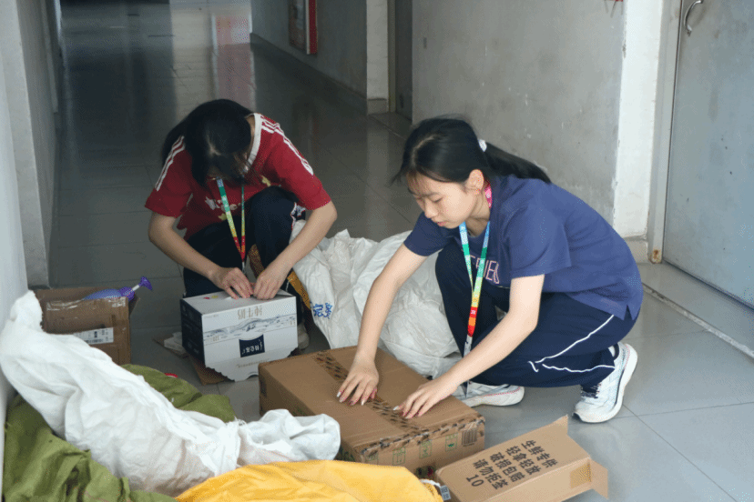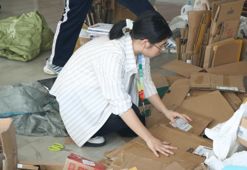 收取完毕后,所有闲置物品被运送至八栋负一楼进行分拣。在这里,志愿者们分工明确,配合默契。他们仔细对回收物品进行分类处理:纸箱被逐一压平捆扎,塑料瓶与易拉罐分类压实打包,衣物纸张等物品则妥善整理归类。整个分拣过程快速有序,每一件物品都得到了妥善安置,等待着它们新的使命与归宿。