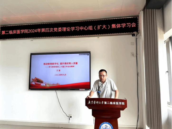 随后,由学校党委理论宣讲团成员、马克思主义学院万奎教授作题为《推荐教育数字化 提升高校育人质量——学习贯彻党的二十届三中全会精神》的专题报告。万教授从教育数字化的内在逻辑切入,系统梳理了世界主要经济体推进教育数字化的进程和新趋势,深入剖析了中国推进教育数字化的必要性和紧迫性,进一步厘清了教育数字化的内涵、特征和目标。围绕如何以教育数字化提升高校育人质量这一核心主题,万教授提出,教育数字化的关键在于“化”,并从环境、内容、方法、评价、教师、模式、治理、文化八个维度提出促进高等教育数字化转型的实施路径,为学院的教育教学改革和发展提供了宝贵的思路与建议。