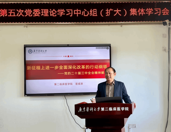 随后,官成浓书记围绕“新征程上进一步全面深化改革的行动纲领——党的二十届三中全会精神解读”进行中心发言,他从党的二十届三中全会审议通过的《中共中央关于进一步全面深化改革、推进中国式现代化的决定》的定位“实践续篇,时代新篇”引入,重点梳理从1978年至今在改革开放进程中的重大会议节点和出台文件的内涵意义,围绕党的二十大报告部署的重要任务为蓝本,突出二十届三中全会改革为什么改、向哪里改、怎么改的关键之问,进一步说明了在推进中国式现代化进程中要坚持改革的目标导向和问题导向,重点提出在面对外部环境的变化、内部面临的问题、党的建设的问题时要保持解决发展与安全的两大核心任务的正确方向与理论实践。围绕“七个聚焦”重要领域,以经济体制改革为牵引,以促进社会公平正义、增进人民福祉为出发点和落脚点,更加注重系统集成,更加注重突出重点,更加注重改革实效的总体思路,提出紧紧围绕推进中国式现代化的14个部分的重要改革方向,并结合医疗卫生改革实践,以福建三明医改为典型案例,重点说明中国式现代化最重要的指标是人民健康,要树立人民至上、生命至上关键理念。紧紧抓住人民群众急难愁盼问题,采取更多惠民生、暖民心举措,及时为群众解难点、疏堵点、除痛点。把人民对美好生活的向往作为我们的奋斗目标,依靠人民创造历史伟业。