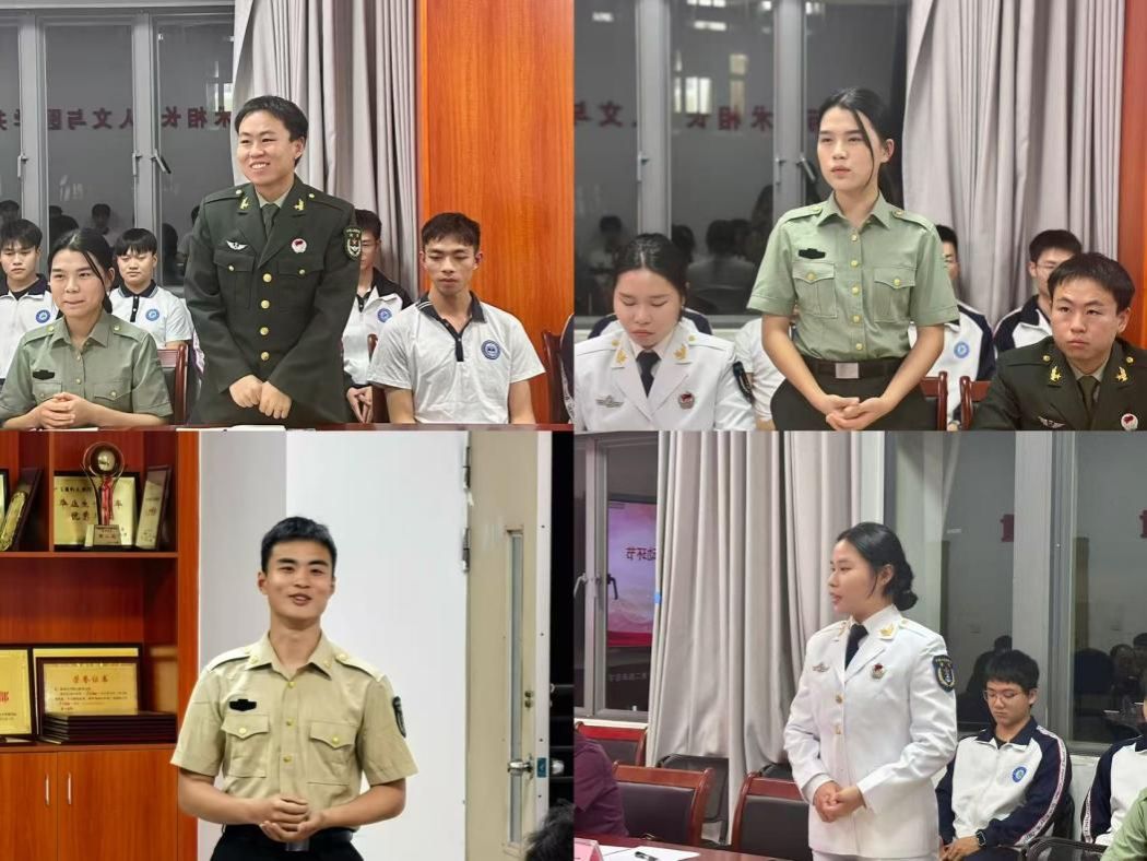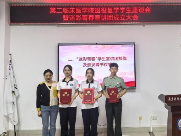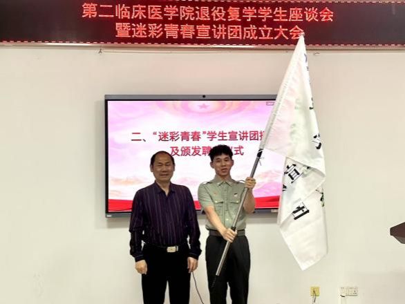 会议伊始,学院组织员宣读《关于成立退役复学学生宣讲团的决定》,宣布成立迷彩青春学生宣讲团。学院党委官成浓书记为宣讲团授旗,吴春丽副书记颁发聘书。新任宣讲团团长朱光详同学作表态发言,承诺以军旅故事传递信仰,以行动践行责任,引领青年学子厚植家国情怀。