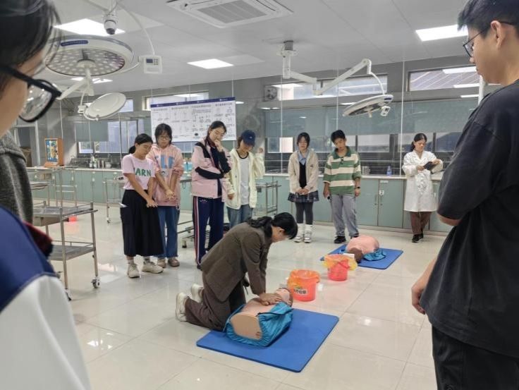 理论学习结束后,进入实操体验环节。现场设置了心肺复苏(CPR)+AED使用实操体验区,参与者被分为若干小组,在学生志愿者和老师指导下,亲身体验模拟人操作。从胸外按压的深度、频率,到人工呼吸的规范动作,再到AED的开机、电极片粘贴、分析除颤等流程,老师们耐心纠正每一个细节,确保参与者掌握正确的急救方法。