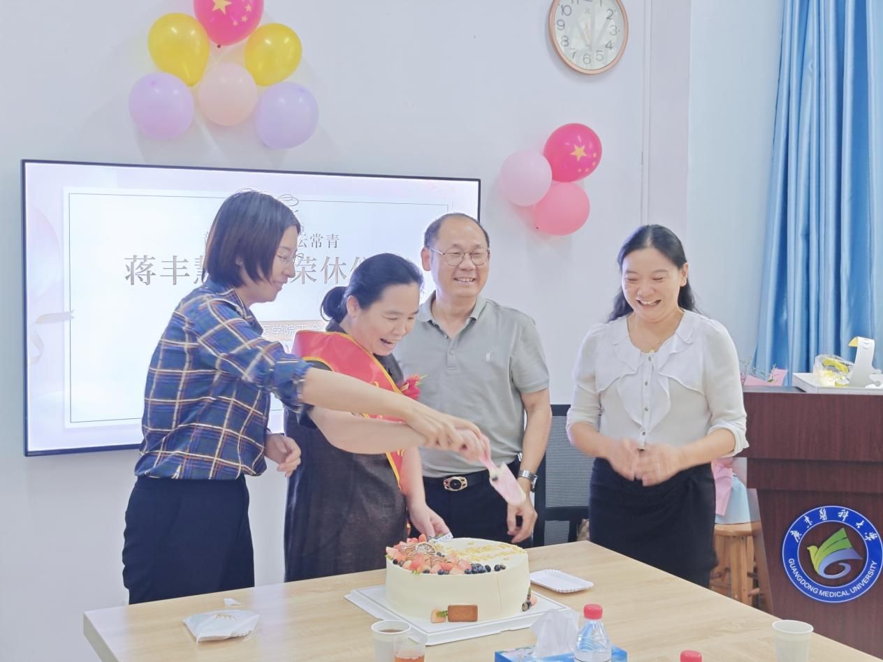 在热烈的掌声中,蒋丰慧老师发表了感人肺腑的荣休感言。她回顾了自己在医疗行业奋斗的点点滴滴,表达了对同事们的感激之情,并对未来充满期待。蒋老师说:“虽然即将离开工作岗位,但我依然会关心和支持学院的发展。”同时,学院也为蒋老师准备了精心挑选的荣休礼品,并共同切下了象征甜蜜与幸福的蛋糕。