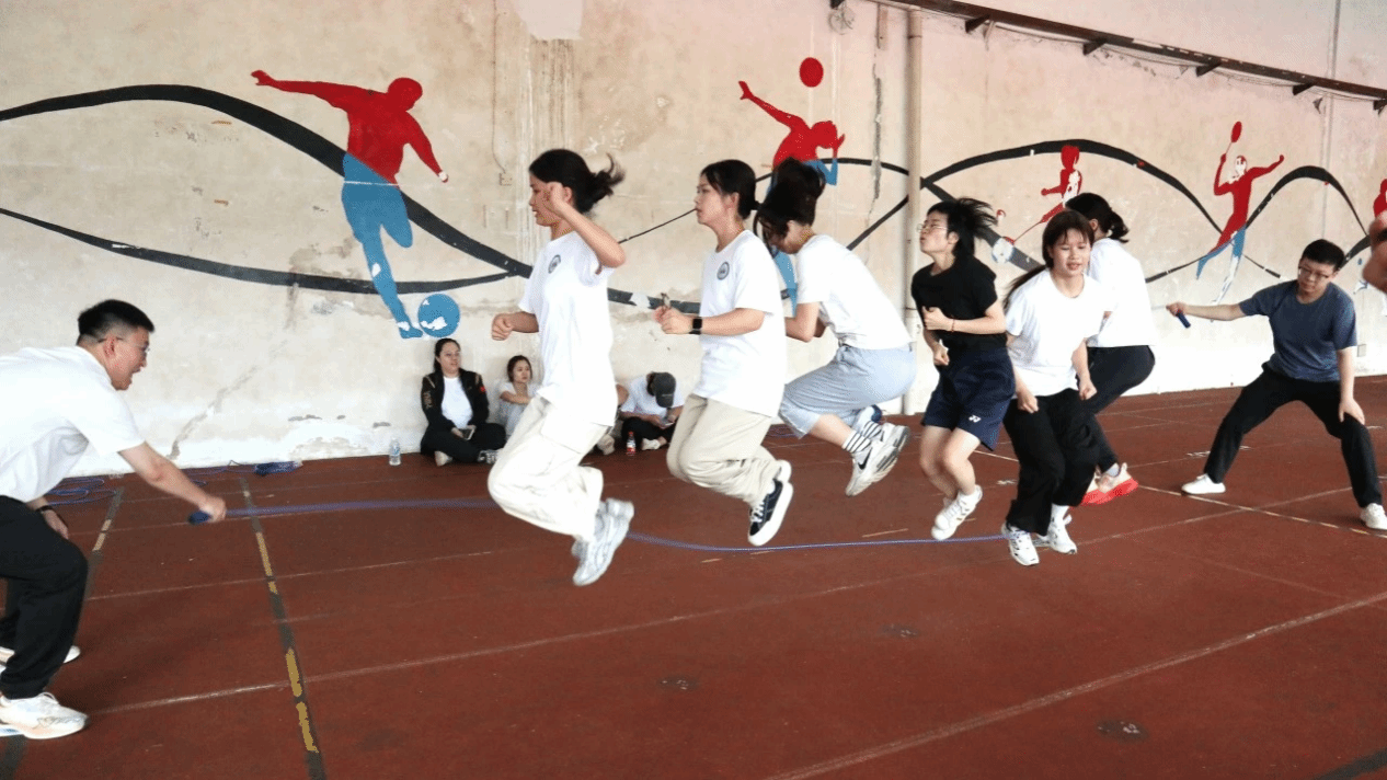 在欢乐跳绳中,当数位队员同时起跳时,那整齐划一的动作仿佛形成了一道美丽的风景线。伴随着欢快的音乐节奏,整个操场沉浸在一片喜庆的氛围之中。