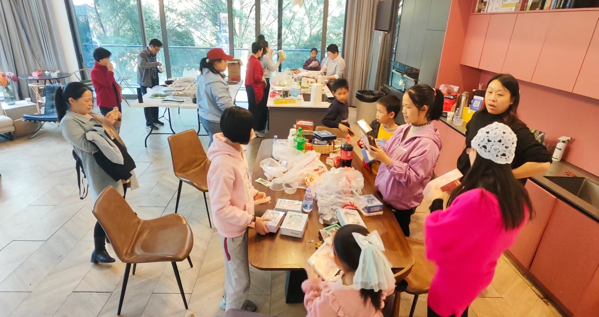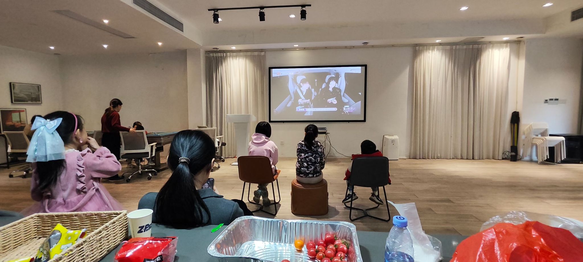 观影结束后,活动进入自由交流与食物分享环节。长桌上摆满了由工会精心准备以及教职工们自发带来的各式点心、水果与饮品。大家围坐一起,畅谈生活趣事,分享工作心得,孩子们则在旁嬉戏玩耍。美食不仅满足了味蕾,更成为连接彼此情感的纽带。不少教职工表示:“平时工作忙,难得有这样的机会和同事、家人一起放松聊天,感觉特别温暖。”